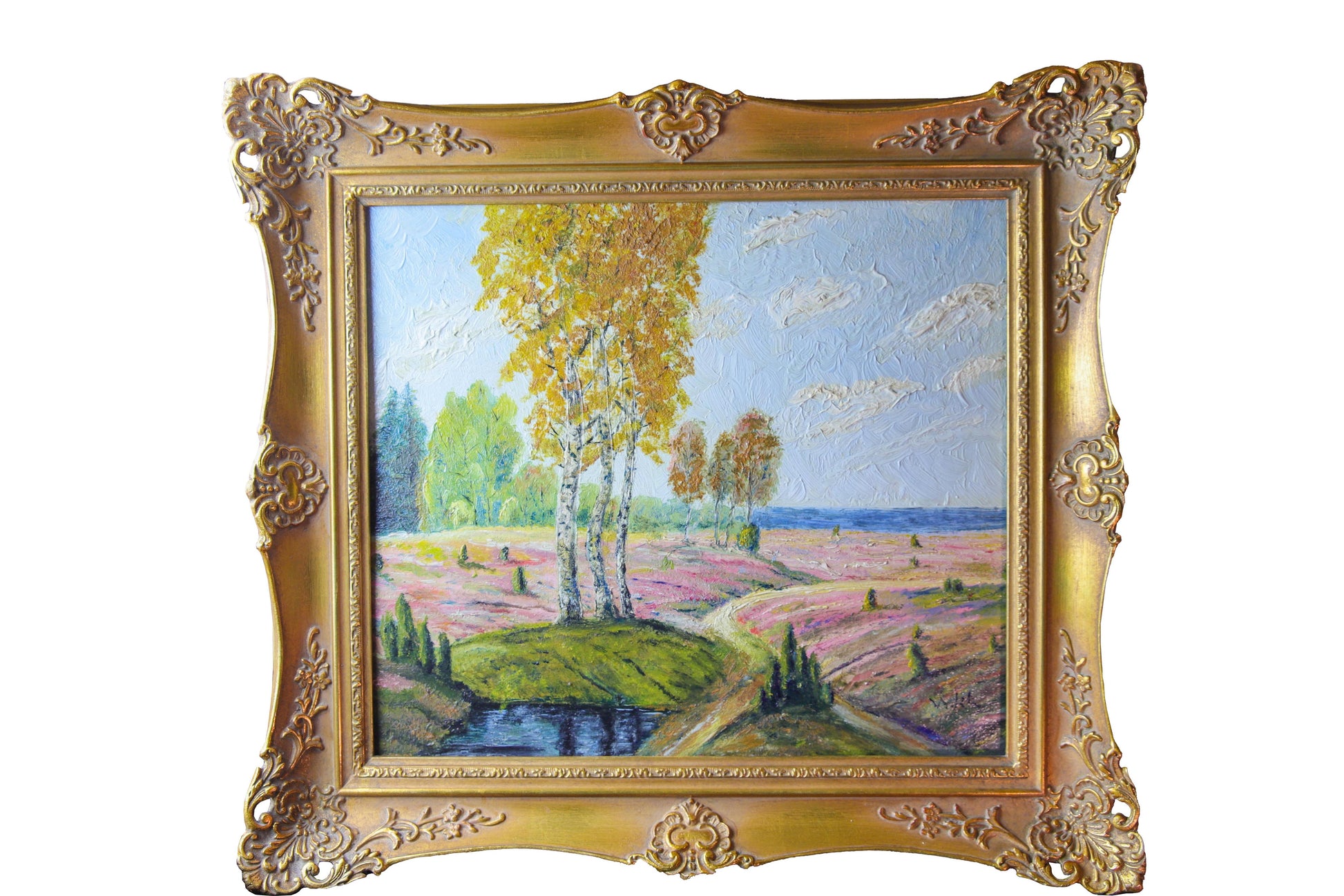 Ein farbintensives Gemälde, das die Schönheit der deutschen Heidelandschaft eindrucksvoll einfängt. Leuchtende Grüntöne, kräftige Violett- und Rosaschattierungen und ein weiter Himmel mit lebendig gemalten Wolken verleihen der Szene Tiefe und Ausstrahlung. Im Vordergrund spiegeln sich Bäume in einem kleinen Bachlauf, während der Blick über sanfte Hügel in die Ferne schweift – ein Motiv voller Ruhe und Weite.