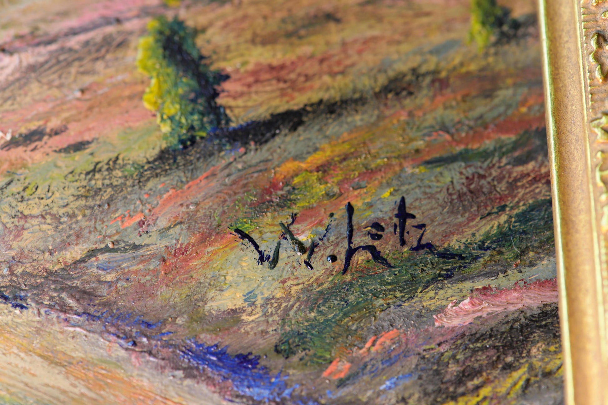 Das Werk stammt von einem deutschen Künstler und trägt seine Signatur. Gemalt in Öl auf Holz, überzeugt es durch klare Strukturen und eine harmonische Farbkomposition. Der goldfarbene, reich verzierte Holzrahmen unterstreicht den klassischen Charakter des Bildes und macht es zu einem dekorativen Highlight für jedes Zuhause.