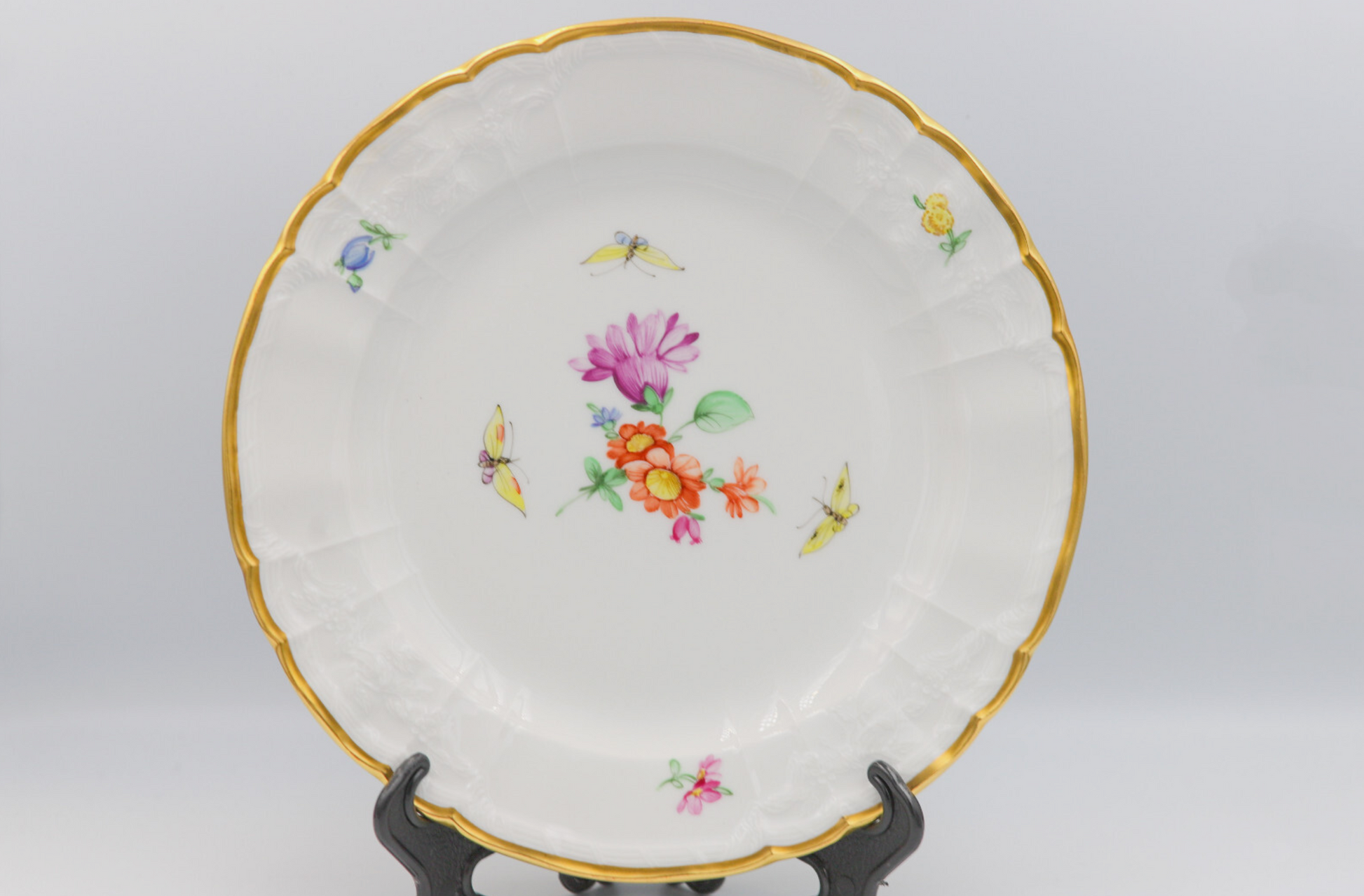 Das handbemalte Blumendekor mit zarten Schmetterlingen leuchtet in harmonischen Farben und wird von einem edlen Goldrand eingefasst. Die feine Reliefstruktur des Porzellans unterstreicht den barocken Charme dieser beliebten KPM-Serie. Jeder Teller ist ein handgefertigtes Unikat – individuell bemalt, mit Liebe zum Detail.