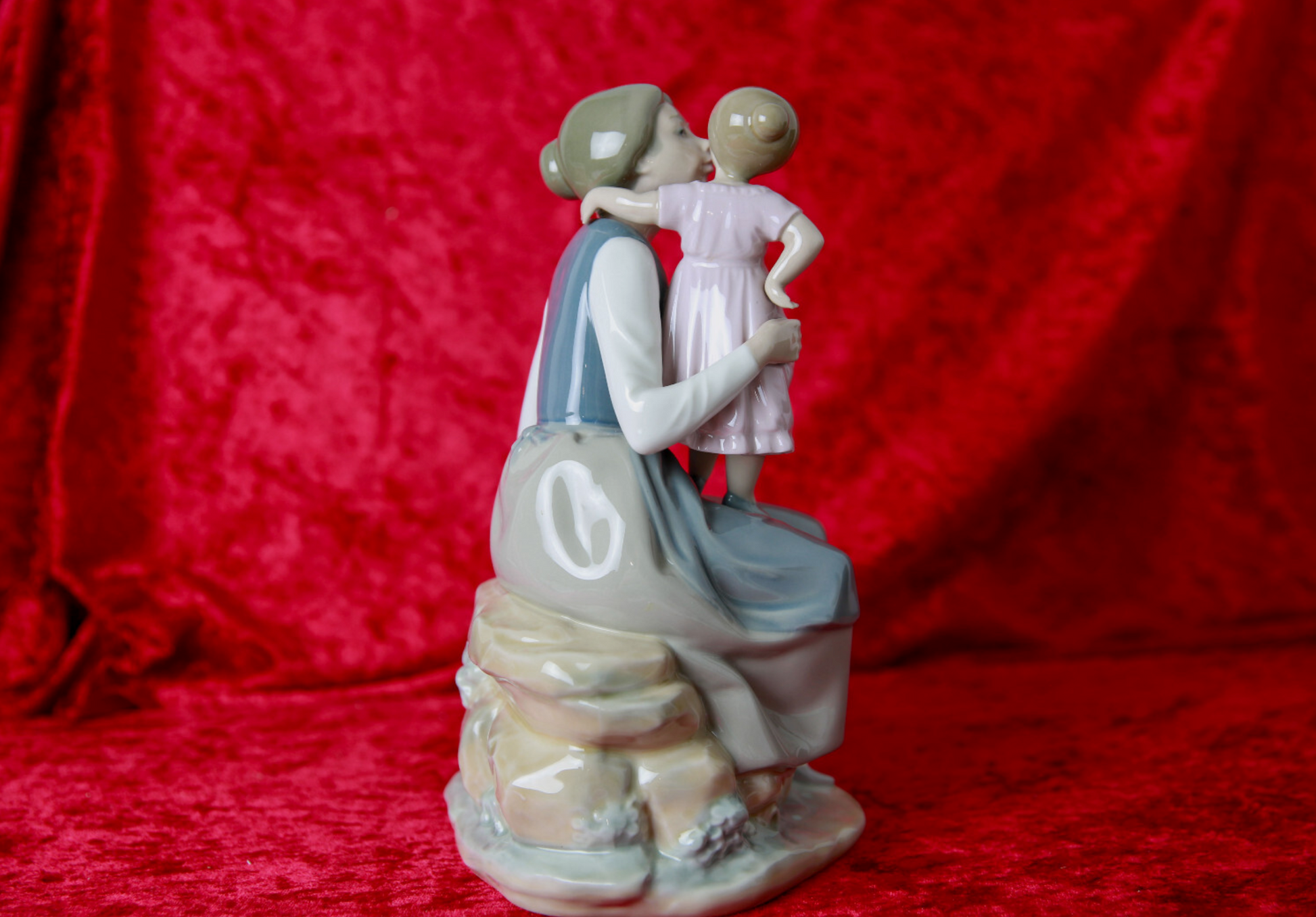Ein inniger Moment, festgehalten in feinstem Porzellan: Diese Figur aus der NAO-Kollektion von Lladró zeigt eine Mutter, die ihr kleines Kind liebevoll auf dem Schoß hält – die Lippen zum Kuss bereit, den Blick voller Zärtlichkeit. Neben ihr ruht ein Korb, doch ihre ganze Aufmerksamkeit gilt dem Mädchen in ihren Armen.