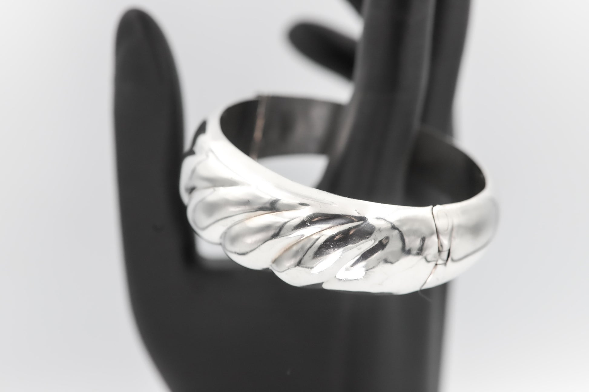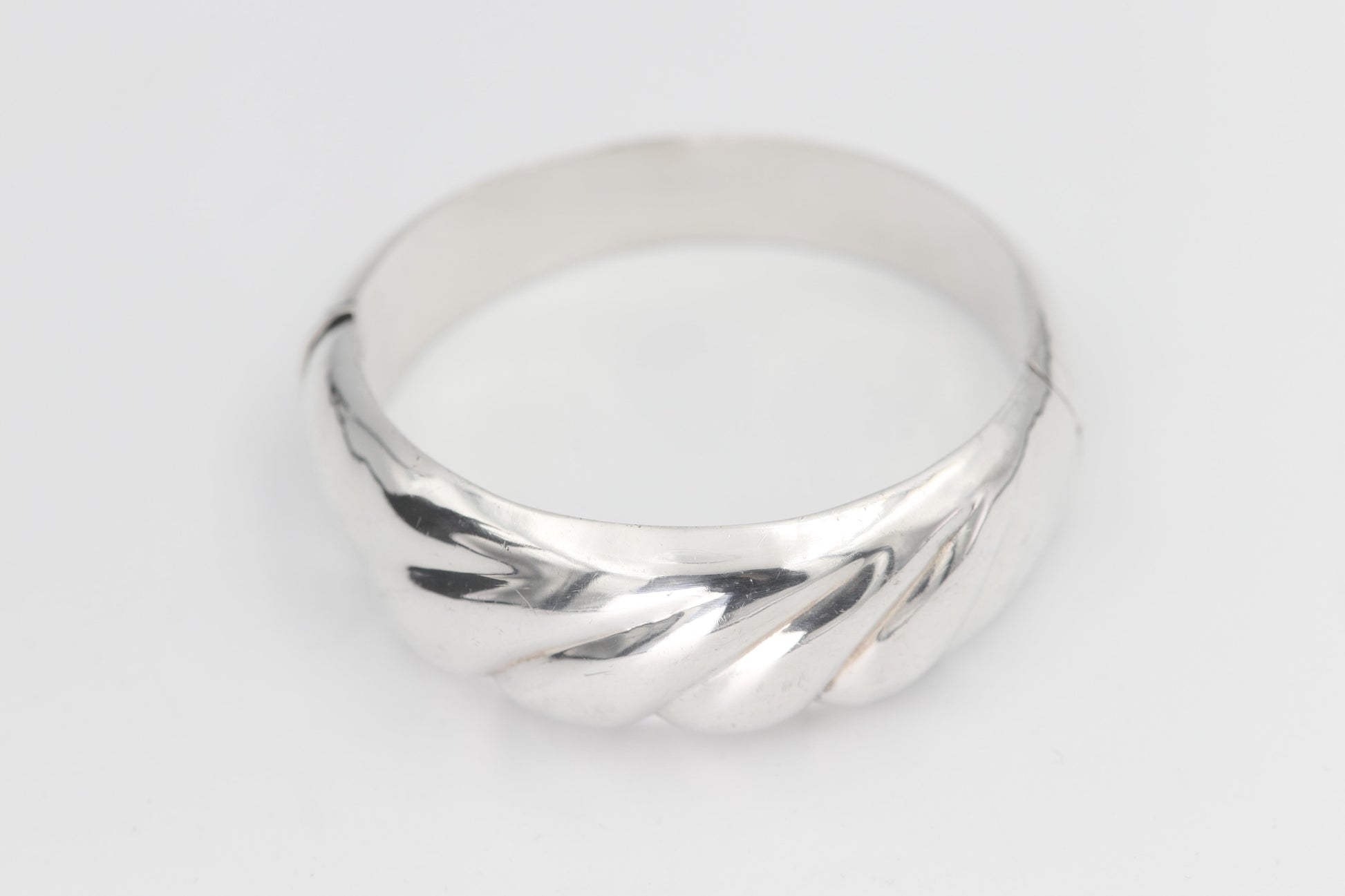 Kraftvoller, massiv gearbeiteter Armreif aus Dänemark in klassisch skandinavischer Formensprache. Die plastische, leicht gedrehte Struktur verleiht dem Schmuckstück eine lebendige Oberfläche und erinnert stilistisch an nordisches Silberdesign der 1960er–80er Jahre, bei dem organische Formen und klare Linien kombiniert wurden.